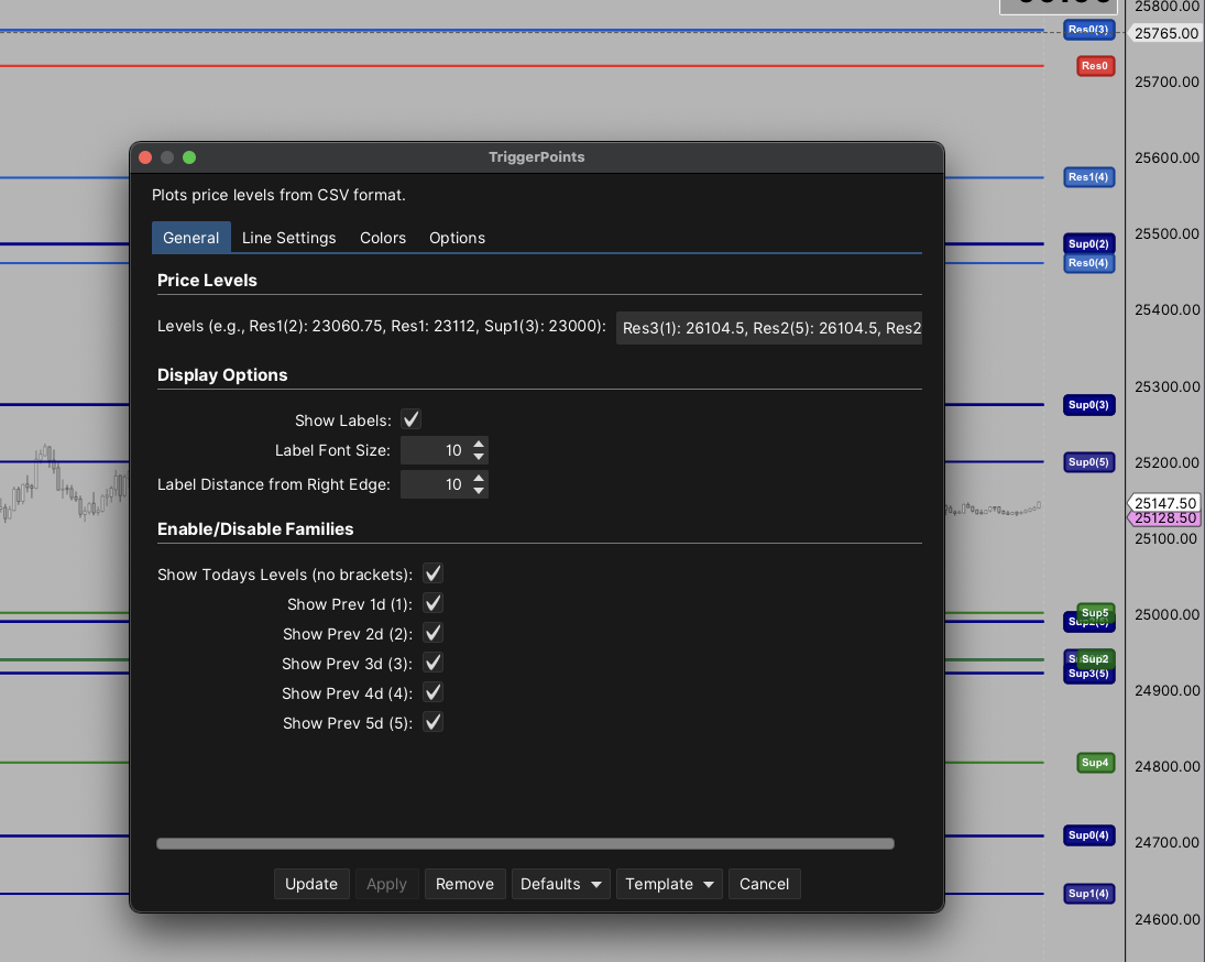 Res1: 23060.75, Sup1: 23000 - Clean interface: Organized settings across 3 tabs (General, Line Settings, Colors)